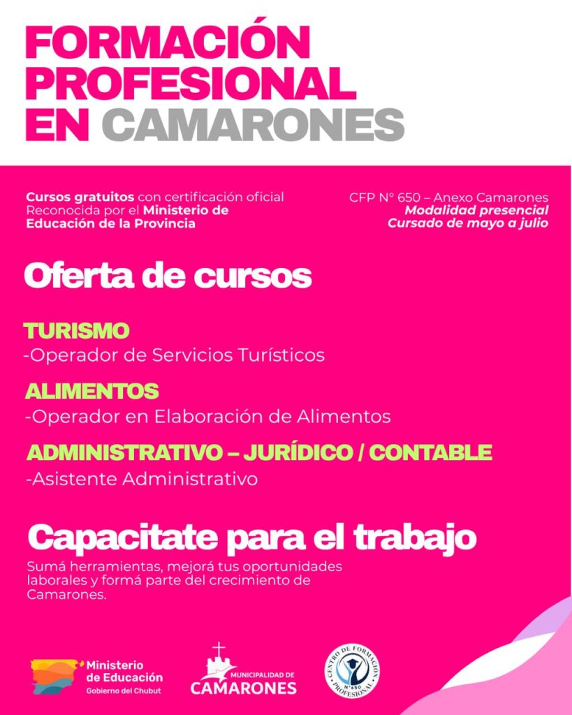 La Municipalidad de Camarones informa la apertura de inscripciones para una nueva propuesta de formación profesional destinada a vecinos y vecinas de la localidad, que se desarrollará a través del CFP N° 650 – Anexo Camarones.