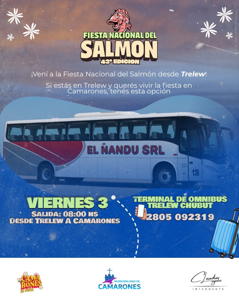 • Camarones suma un servicio especial de transporte desde Comodoro para la Fiesta Nacional del Salmón 24 de marzo de 2026
